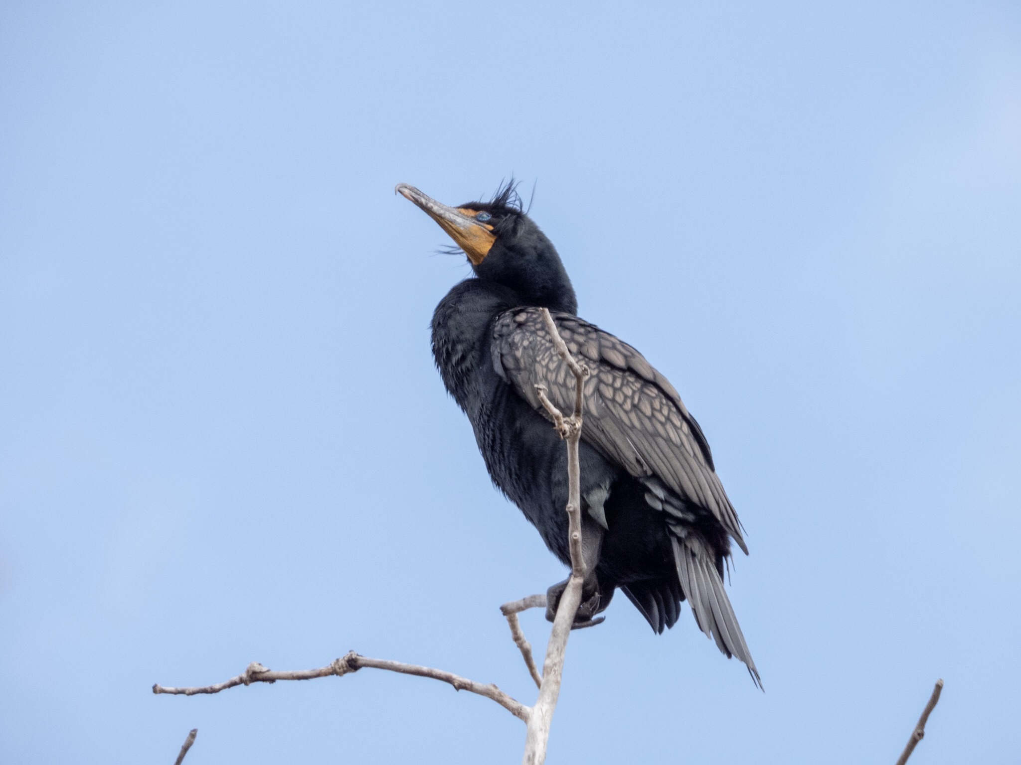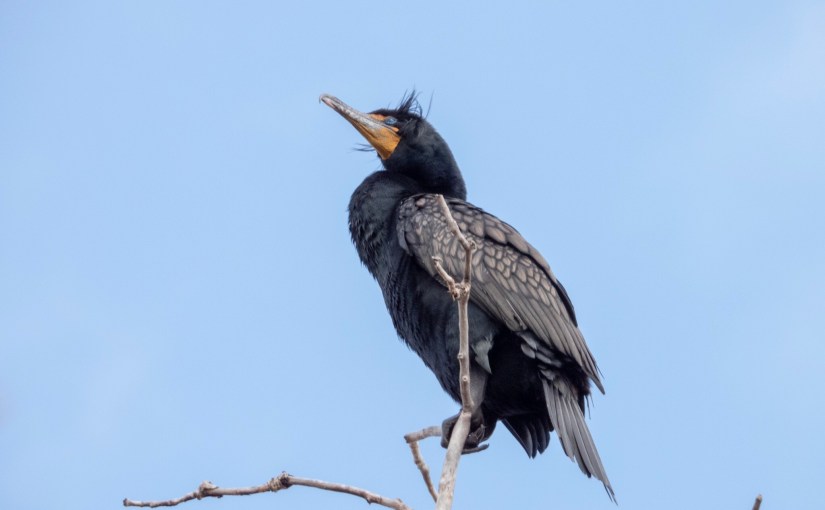 I came across a single Double-crested Cormorant at Heritage Wetlands Park in Sherwood Park a few days ago. Cormorants tend to hang out in colonies so this is likely an early bird. eBird records show that up to 16 cormorants were recorded at this location last summer (in May) and that they start arriving around mid-April and stay until the end of September. The Double-crested Cormorants appear black form a distance but upon closer inspection, particularly if the light is right, one can see a subtle beautiful pattern emerge on their wings. It almost looks painted. This particular individual, lets call him/her Early Bird, was perched at the very top of a tall tree, almost as he/she wanted to show everyone “Check me out, I got here first!”. One can also see that Early Bird has a bit of bad hair day, either that, or its a tad breezy way up there.