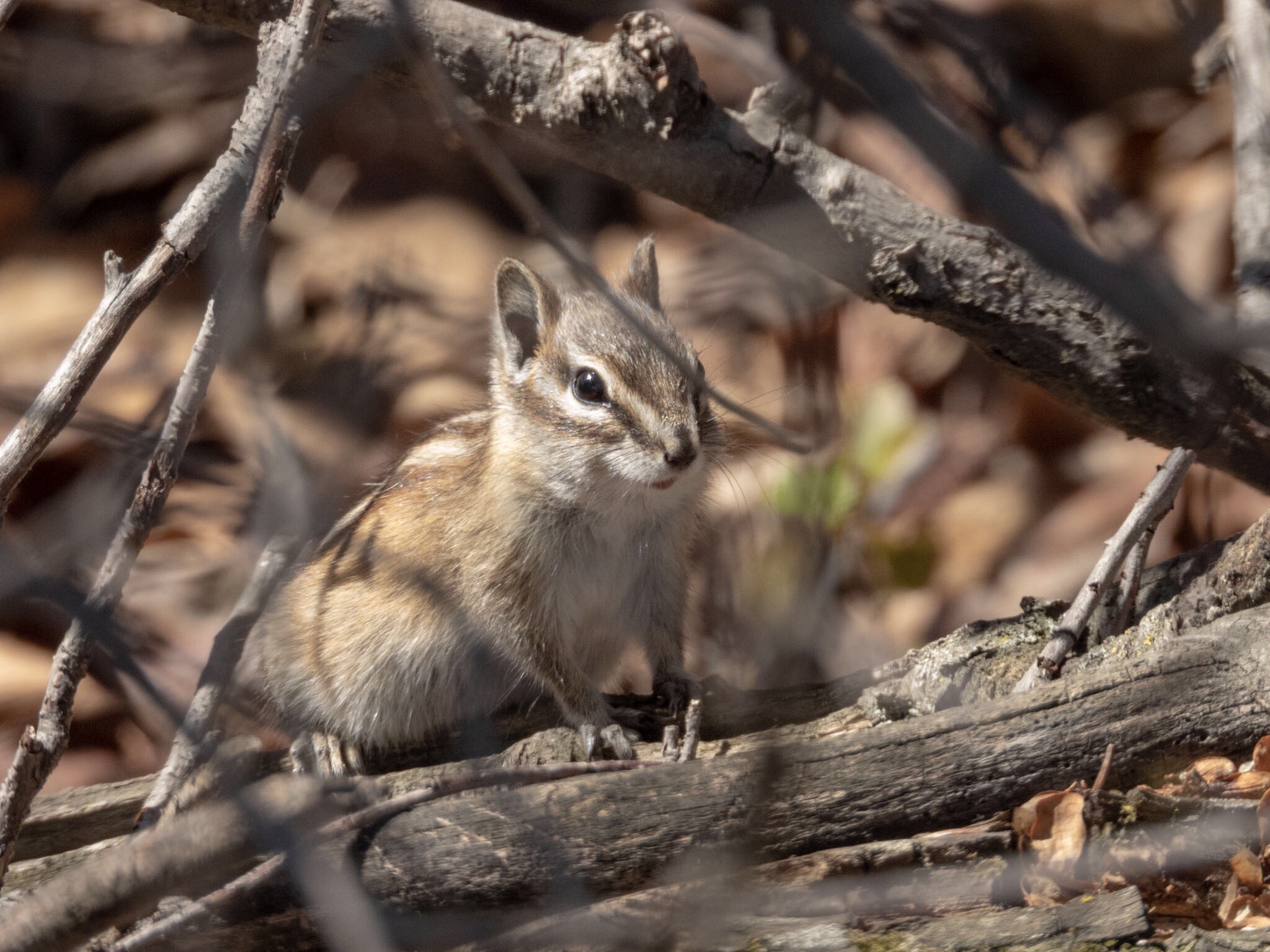 Last Sunday I went on my first bike field trip down to the Whitemud Ravine and through the river valley. It takes a bit of practice to bike, and, at the same time, be ready to bird and take pictures. Where do your keep your binoculars, camera and notebook while biking? You want this gear to be accessible yet out of your way while biking. Hanging the binoculars and camera around your neck does not work so well when on a bike. Still working on the logistics of that, but I am looking forward to doing more bike birding, or nature biking during the summer. The first critter I encountered when I arrived at the ravine was this diminutive Least Chipmunk (Neotamias minimus) scampering through the understory. He was bit apprehensive of the large critter staring at him and making weird noise (that would be me) yet too curious to just run away without checking out what the commotion was about. The Least Chipmunk is the smallest species of chipmunk and the most widespread in North America. These chipmunks are diurnal (primarily active during the daytime), which is probably a good idea considering the nearby Great Horned Owl family.