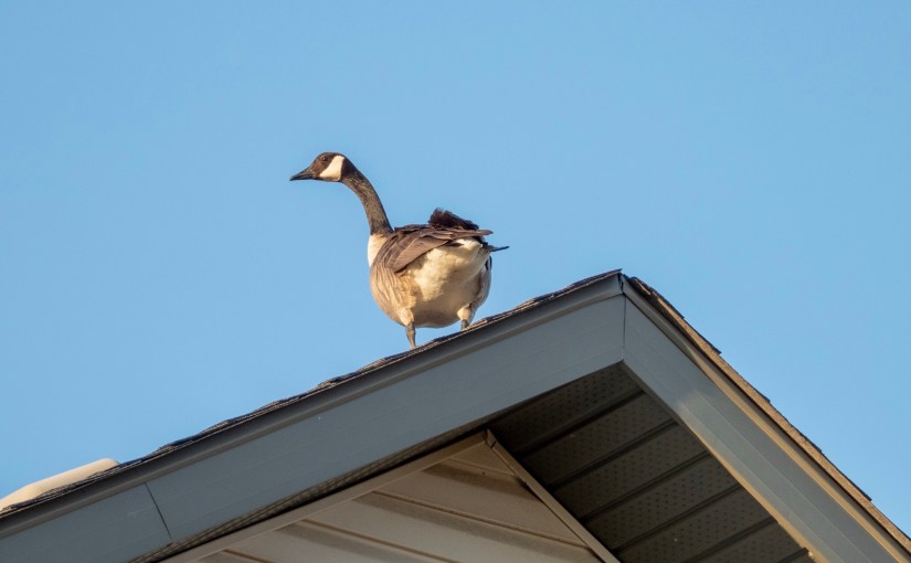 Canada Geese are big birds with an even bigger attitude. There does not seem to be much that faze them. As probably one of the most common birds in these neck of the woods it easy to start ignoring them in favour of more exciting and uncommon birds. This fella, however, was out to make a statement that could not be ignored. Perched on the ridge of the roof of a large house overlooking the the Heritage Wetland Ponds, this Canada Goose was not lacking any self-confidence. I spend quit some time watching it and it seemed quite comfortable hanging out at its lofty and exposed perch. The only predators that could threaten an adult Canada Goose would be non-flying animals such as coyotes, cats (big cat, not your domestic kitty), foxes, dogs and humans. In other words, while this fella may be in an exposed location the biggest threat facing it would be inclement weather. Not on this day though, the sky was blue with not a cloud in sight and this goose was the king (or queen) of this roof.