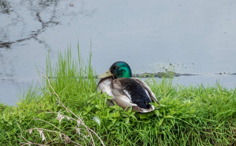 The very first bird we spotted as we arrived at the oxbow pond down at the Whitemud ravine was a male mallard that was snoozing on a log. The log was covered in lush greenery with the mallard cosy like a bug in a rug in the greenery. It was very idyllic and looked quite comfortable. Oxbow ponds are unique habitats where the water is still and stagnant compared to the rushing water in the creek. There are rumours of numerous oxbow ponds along the Whitemud creek. So far I have found two, both almost entirely covered with thick riparian vegetation making them surprisingly difficult to spot although they are only steps away from the trail. This particular oxbow is the largest one I have found so far and is bound by an old beaver dam at the north end and a wall of accreted sediments on the south end. Groundwater and seepage from the west side of the ravine feeds the oxbow, as does spring and surface runoff. Other than seasonal fluctuations in the water level the water is completely still in these pond.