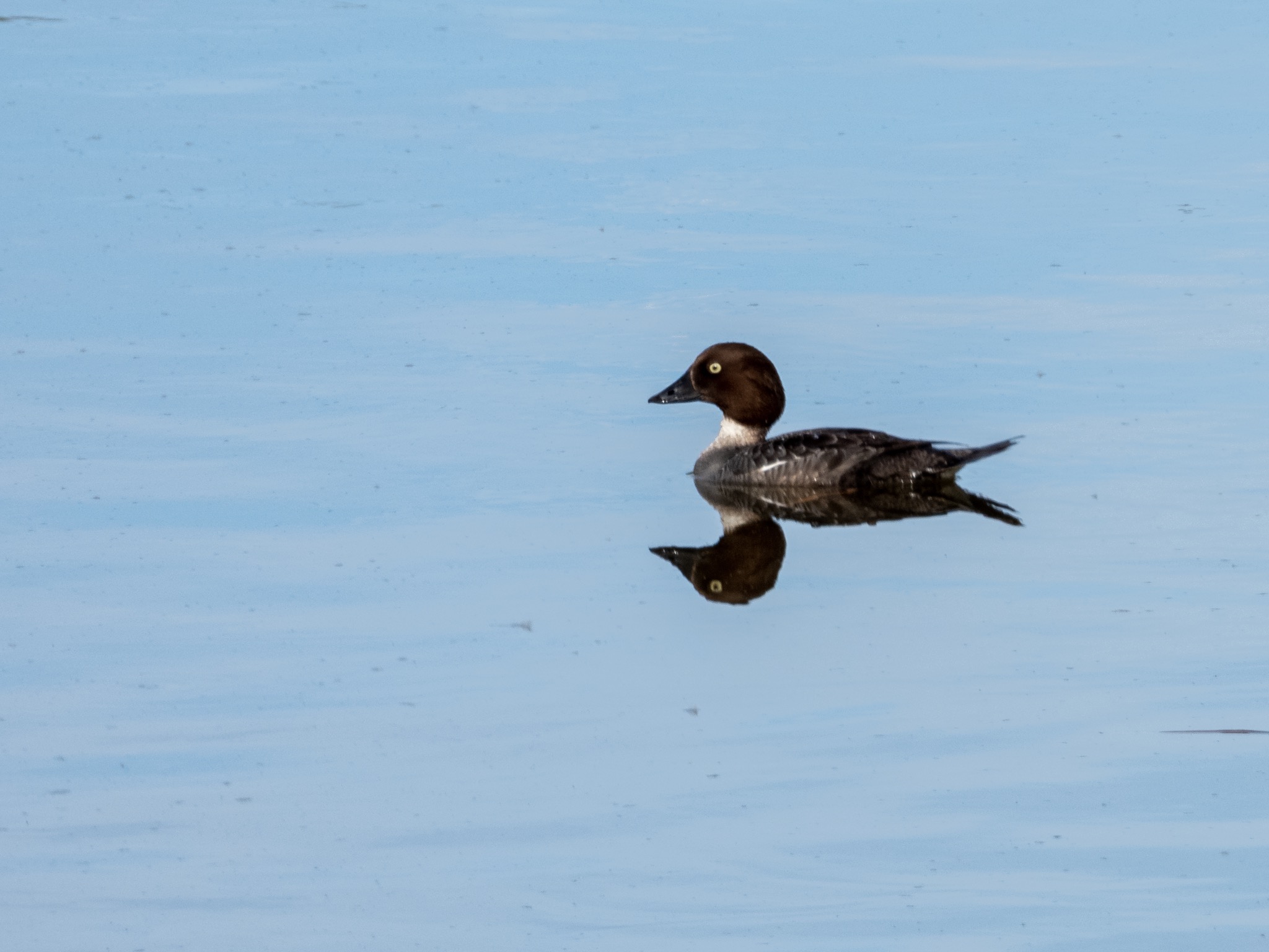 As I crossed the pedestrian bridge across the Whitemud Creek a lone female Common Goldeneye (Bucephalus clangula) was swimming around in the creek eyeing me curiously. Common Goldeneyes are medium-sized diving ducks where the females are brunettes with a piercing golden-yellow eye. There are two species of goldeneyes, the Common Goldeneye, which as the name suggests is more common, and, the more rare, Barrow’s Goldeneye. While the males of the two species are easy to tell apart, the females are more difficult to distinguish as they appear nearly identical. According to Sibley the Barrow’s Goldeneye female has a darker brown head than the Common Goldeneye which does not help me at all since I did not have the two species next to each other for comparison. Perhaps the best distinguishing characteristic between the females of the two species for someone like me that has only seen a handful of these species is the bill color. According to Sibley the female Barrow’s Goldeneye has a “usually mostly yellow” bill while the female of the Common Goldeneye has a “usually mostly black” bill. Looking at the picture I would say that her bill is definitely in the category “mostly black”; ergo, it is a Common Goldeneye.