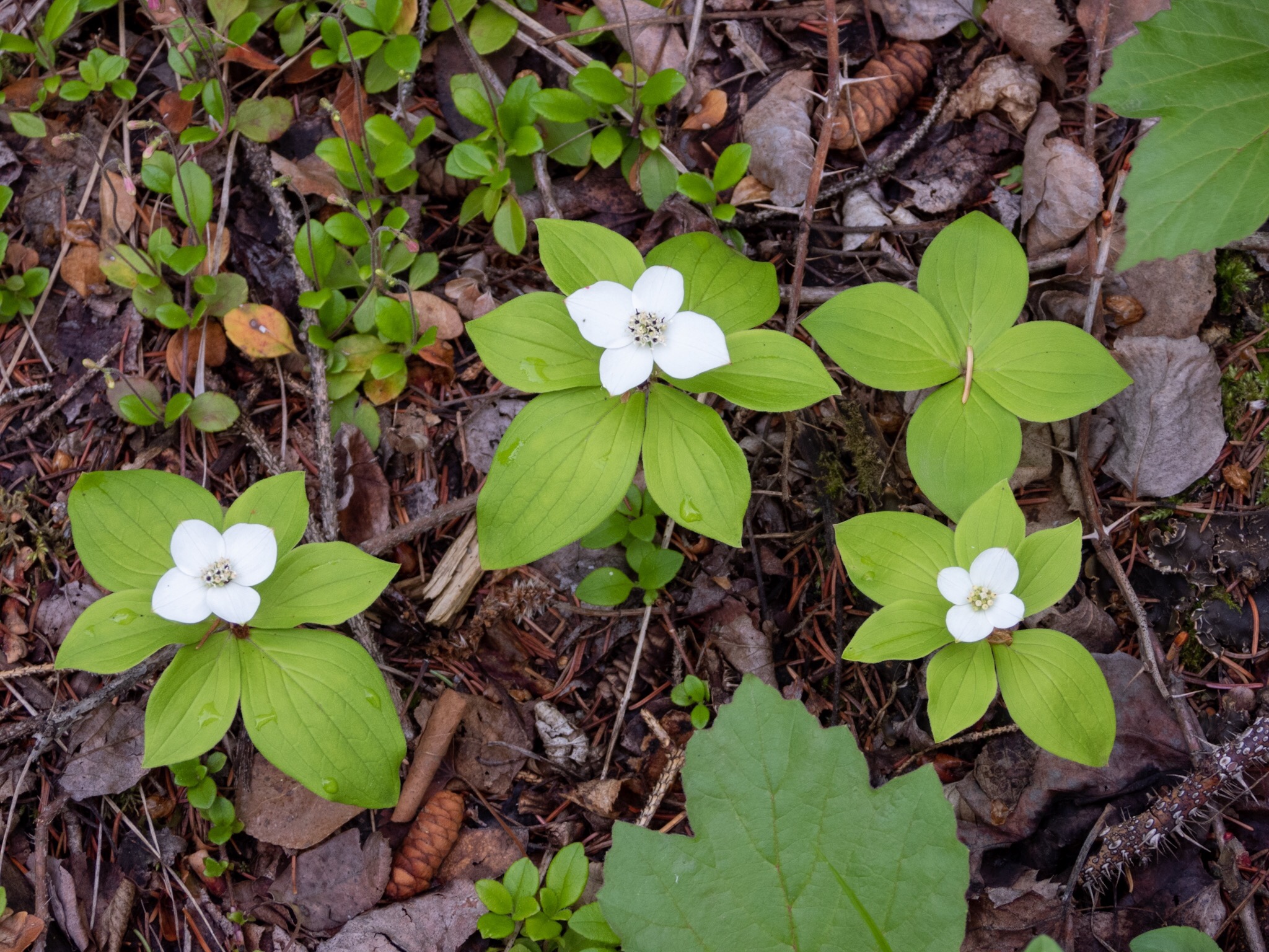 I have been seeing these white flowers on the first floor all over the place. To continue in a state of ignorance is obviously unacceptable when it comes to something you encounter in every forest you visit. Sure enough, they were not difficult to identify. These are Bunchberries (Cronus canadienses), also known as Bunchberry Dogwood, a common plant carpeting moist forest floors throughout Canada. This unassuming plant has been referred to as the fastest moving plant in the world due to the curious way in which the plant spreads its pollen. The stamens in the Bunchberry are like miniature medieval trebuchets and, when triggered by an insect, launch the pollen into the air to coat the unsuspecting insect. If I would have known about this I would have definitely tried it out by poking at the flower. This is just a botanical ballistic experiment that I have to do next time I come across these plants. The original study reporting this remarkable pollen spreading strategy was published in the journal Nature in 2005. Here is a link to the paper, but you need a subscription to access the article. There is, however, a freely available PDF here and there is also lots of information, including videos of the process, on the website of the author.