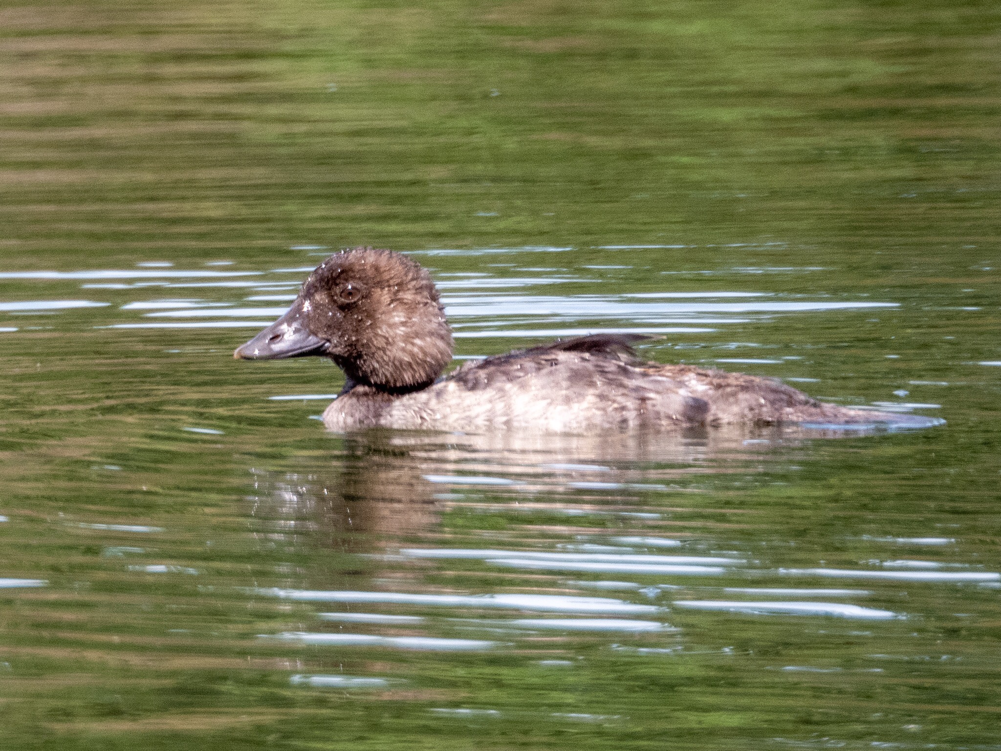 Common Goldeneyes have a distance appearance as adults. Females having a chocolate brown head, yellow eyes and males have a distinct white cheek patch. When I spotted this fella chugging through the pond in Hawrelak park my initial hunch was that its overall shape reminded me of a Common Goldeneye, yet none of the other physical characteristics were there (no yellow eye, no check patch). Upon closer research this is likely an immature Common Goldeneye. Common Goldeneyes are diving ducks and this fella certainly lived up to that reputation as it was energetically diving, popping up for a few seconds and then disappearing under water again. If you look closely you can see his head covered in water droplets and sporting a fuzzy wet do.
