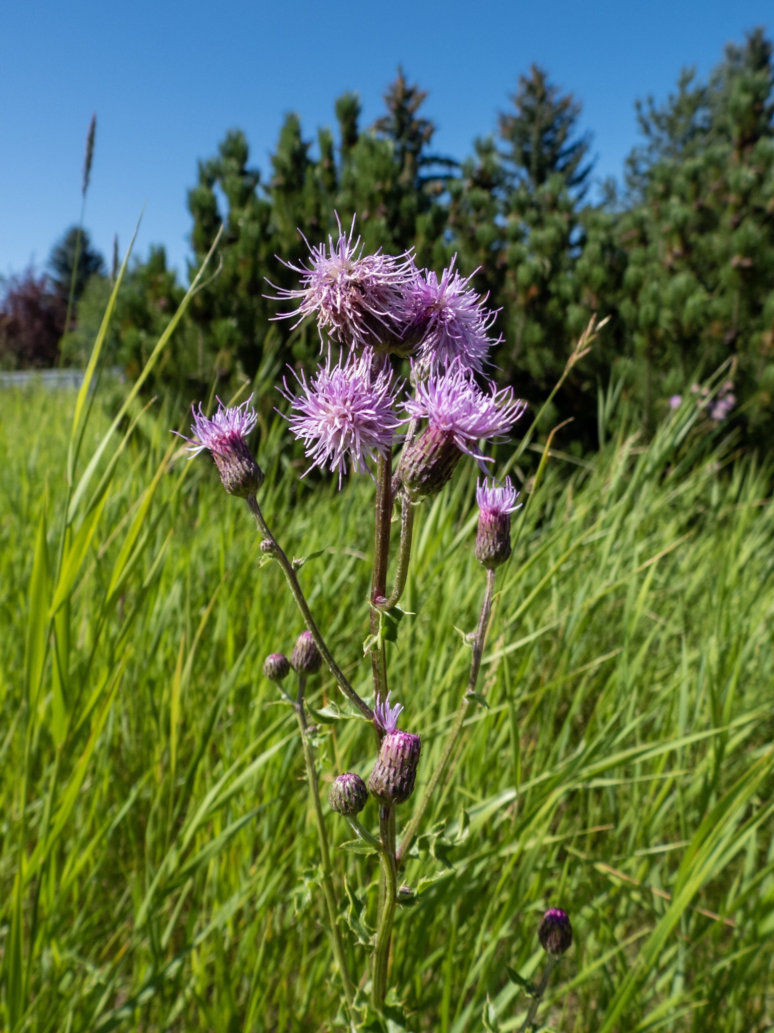 Another pretty flower with an insidious secret. We came across the Creeping Thistle the other day just off the Whitemud Creek as we were on a nature bike ride. Just like other recent pretty flowers we have come across (for example, Cow Vetch, Red Clover and Meadow Buttercup) the Creeping Thistle is an invasive weed that was introduced from Europe and Asia. To add insult to the injury it is often referred to as Canada Thistle, which is of course misleading since it is not of Canadian origin. As far as I can tell, it was introduced in North America accidentally, most likely as a contaminant in crop seeds. There used to be a Thistle Patrol here in Edmonton that went around to natural areas pulling out creeping thistles. Although there are effective herbicides that kill the plant they also kill the native plant, so the incentive behind the Thistle Patrol was to remove this invasive weed manually to avoid the need for spraying herbicides. I have not been able to find any information about the Thistle Patrols activities these days (most recently they seemed to be active in 2013), perhaps the patrol has retired. Did they “win” the battle against the Creeping Thistle or was it too big of a job to keep up with? Who knows?