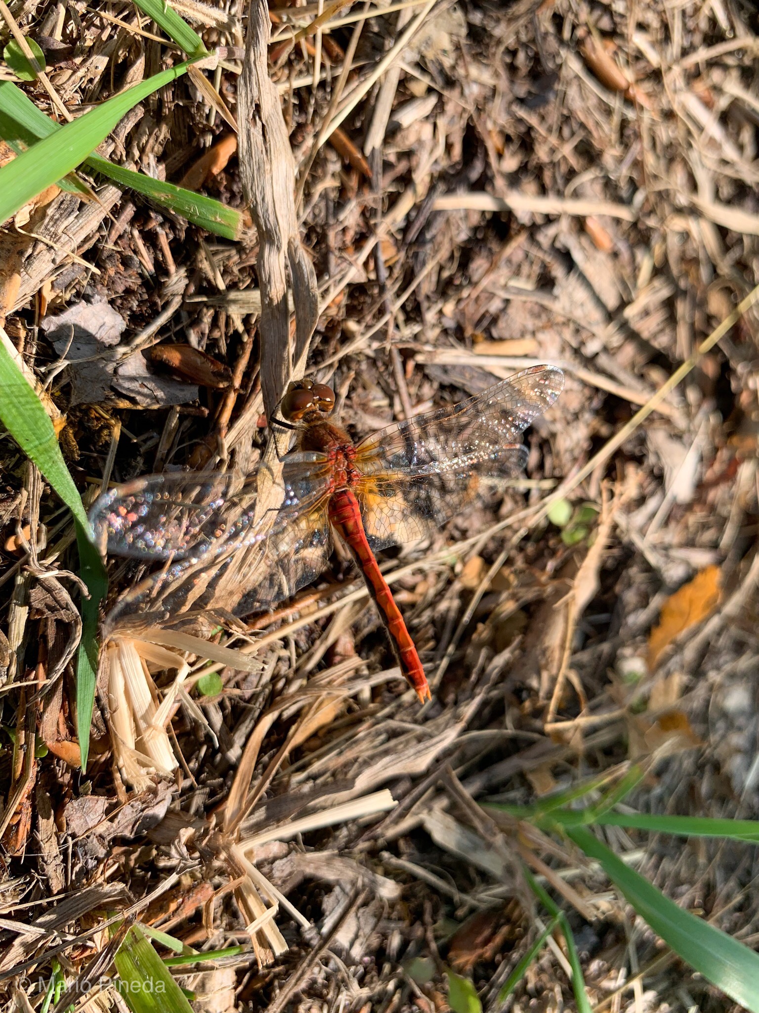 Dragonflies are a bit of an oxymoron. While everyone is able to instantly recognize a dragonfly, very few people know the names of the various dragonfly species, never mind being able to tell them apart and identify them. I am no different. We had just finished a trail ride in Cooking Lake-Blackfoot Provincial Recreation Area and had taken a break for a snack at the Waskahegan Staging Area when a couple a dragonflies landed on a sunny patch on the ground right next to us. My camera was out of reach and I did not want to spook the dragonflies so I decided to try to use my phone to take some pictures. I took a few pictures from some distance away and then I slowly moved to phone closer and closer thinking that they will for sure take off. But they stayed. I managed to get about a foot away from this one dragonfly (the phone was not able to focus at a closer distance) and managed to take this close up. At the time I had no idea what it was, other than a dragonfly. After a bit of research it appears that it most likely is a species of Meadowhawk, specifically a Cherry-Faced Meadowhawk (Sympetrum internum), but there are a few other species of Meadowhawk that look very similar. The name “Meadowhawk” is quite telling of the ecology of this species. It is found near marshy ponds, lakes, slow streams and on meadows. Like all dragonflies, the Meadowhawk is a predator. I can just picture it patrolling the meadow like a hawk for any soft-bodies flying insects such as mosquitoes, flies, moths and mayflies.