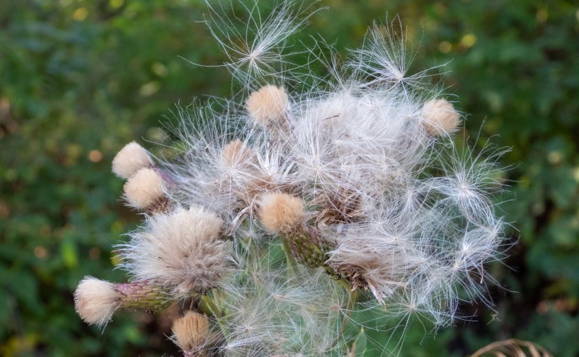 The seeds of the Creeping Thistle are about to get airborne. All it will take now is the slightest of wind puffs and they are on their way. This inflorescence almost looks like it has a bad hair day. But it will not last. Soon the seeds will be gone with the wind. Each Creeping Thistle plant can produce thousands of seeds at the end of the summer. In addition to reproducing using wind-dispersed seeds, the Creeping Thistle also reproduced vegetatively by creeping roots (rhizomes). These two reproductive methods result in the plant being a formidable weed that, once established, is virtually impossible to eliminate. It often invades crop fields and grasslands where it lowers crop yields and forage productivity.