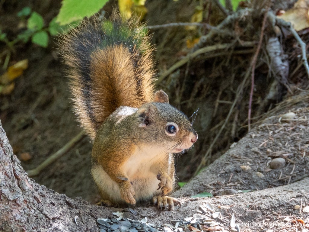 The American Red Squirrel loves to munch on seeds, particularly sunflower seeds when these are provided by their human subjects. Sunflower seeds do not occur naturally in the Whitemud Ravine but people distribute sunflower seeds by the bags along the trails so there is always plenty to go around. A diet that predominantly is based on seeds is sometimes referred to as seed predation or granivory. The Red Squirrels are opportunistic and will incorporate a range of food items into their diet such as fruit , berries and fungi. This fella that we encountered along the trail was to busy munching on sunflower seeds to really care about our presence. The light in the picture allows one to clearly see the typical dark band across the bushy tail.