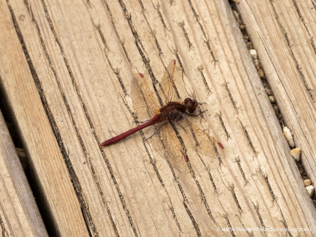Its name must have been Danger. Meadow “Danger” Hawk. How else could one explain it deciding to land and chill out on the wooden boardwalk that goes around the Heritage Wetland Park. It seemed to be a rather inopportune location for a rest. With kids and dogs running along the boardwalk, cyclists zooming by and the odd birder not paying attention where they step as they scan the skies for exciting finds. This birder did spot the Meadow Hawk, however. I quietly suck up to it to see how close I could get before it got spooked. I was only about a meter right above it snapping pictures when it decided that it had had enough and took off.