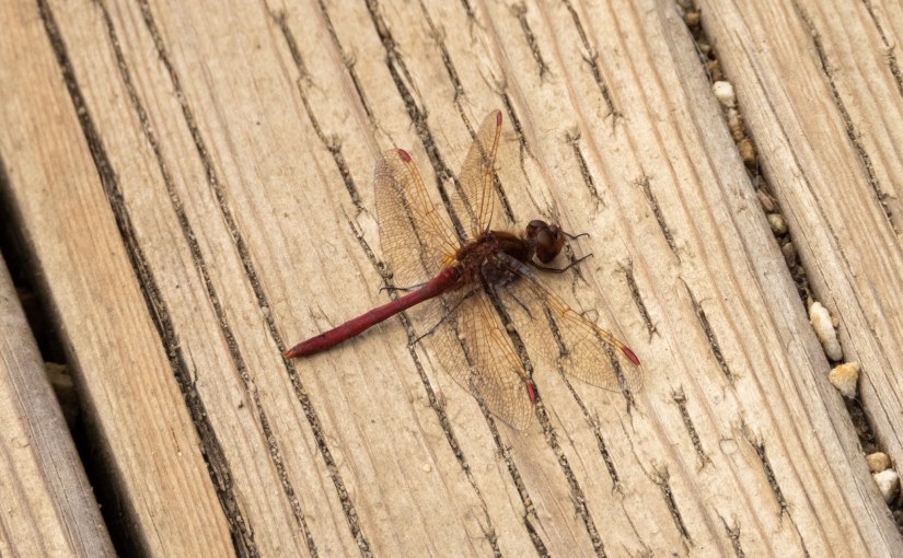Its name must have been Danger. Meadow “Danger” Hawk. How else could one explain it deciding to land and chill out on the wooden boardwalk that goes around the Heritage Wetland Park. It seemed to be a rather inopportune location for a rest. With kids and dogs running along the boardwalk, cyclists zooming by and the odd birder not paying attention where they step as they scan the skies for exciting finds. This birder did spot the Meadow Hawk, however. I quietly suck up to it to see how close I could get before it got spooked. I was only about a meter right above it snapping pictures when it decided that it had had enough and took off.