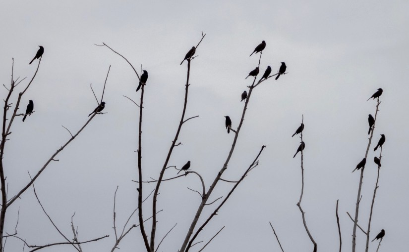 Perched high up in the leafless trees there was a band of American Crows. They seemed wary and worried, looking around like in all directions, carefully watching every movement around them. It did not take long to figure out what had them on the edge. A Merlin was perched in a nearby tree. Suddenly the Merlin took off on what looked like a patrol – sort of just checking things out. But the crows did not take any chances. The whole flock took off simultaneously and started flying back and forth over the tree grove making a lot of noise. Once the Merlin landed in a tree again, the crows settled down and landed as well. One would think that the cows would find safety in their numbers or that they would figure out that they far too large for a Merlin to catch, after all they are about equal in size. But, nope. These fellas were real chickens.