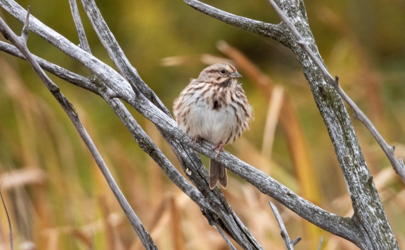 A Song Sparrow hiding among the reed was letting everyone know it was there. Song Sparrows can be found in our city parks until the end of October at which point most of them head south to continental USA. Occasionally, however, the odd one decides to stay behind braving the local winter. True to its name, the Song Sparrow has a colorful repertoire of songs. In one of his journals Henry David Thoreau suggested that the song sounded to him like “Maids! Maids! Maids! Hang up your teakettle-ettle-ettle.” Song sparrows tend to develop local dialects and some people even claim that no two Song Sparrows have the same song. There is a collection of recorded songs here to give you a taste of the diversity of songs. The typical “three short identical notes followed by a longer one” has even been compared to rhythmical pattern of the beginning of Beethoven’s Fifth Symphony. I am not entirely convinced about the Beethoven’s Fifth comparison but I will keep my ears peeled next time I am listening to a Song Sparrow.