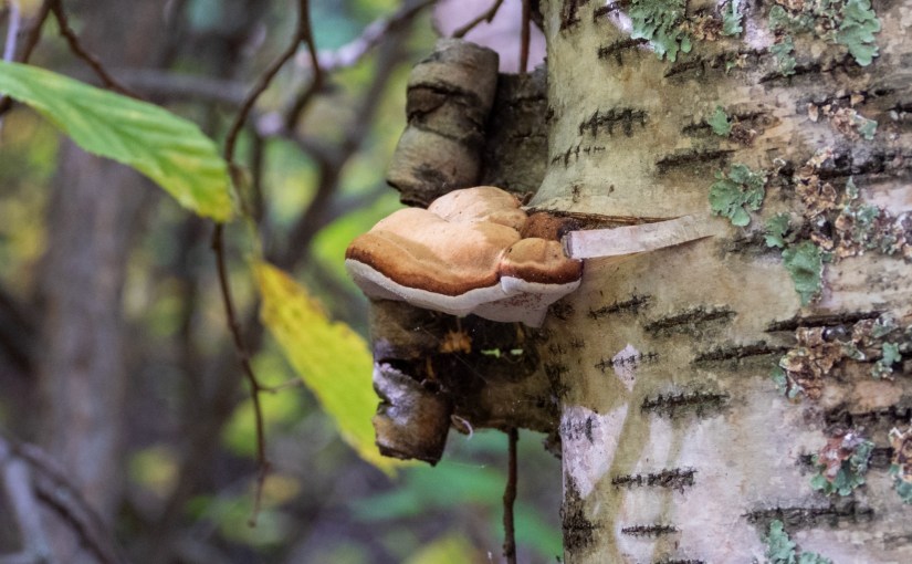 Tree conks are the the fruiting bodies of fungi growing inside tree. They are an ominous signs that the tree is decaying from the inside out. This harbinger of death can be quite pretty though. I came across this stunning conk on a paper birch at the heritage Wetlands park. With a brown gradient on the top, a crisp dark brown line along its waist and a white underside it almost looked like it had been painted with water colors. The decay process is typically slow and conks can grow quite large. The lifestyle of growing on dead or dying organisms called a saprotrophic lifestyle and, while it does not sounds very glamorous, is a important ecological role of many fungi. What dies has to be recycled and fungi and bacteria are key players making this possible.