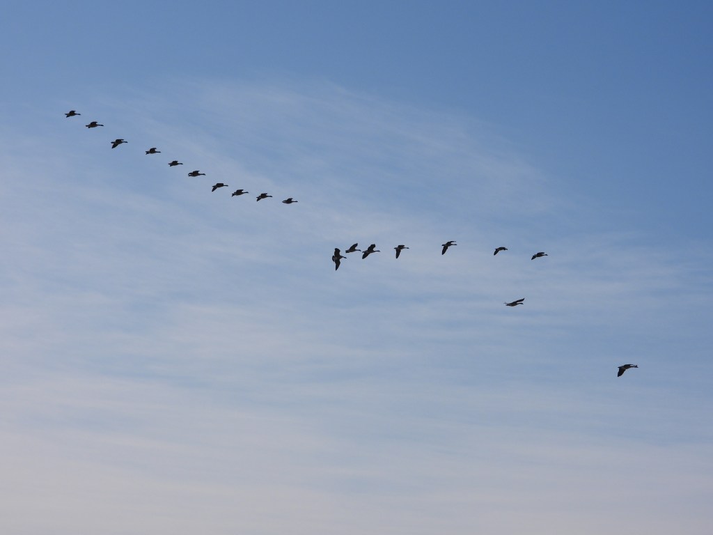 If it would not have been for their characteristic calls I would have missed the gaggle of Canada geese flying overhead at the Heritage Wetlands Park. It was a sunny day with a steel blue sky and the large dark birds stood out distinctly against the backdrop. I was about to dismiss them, after all, Canada Geese are one of the most common year-round occurring birds in these neck of the woods, when my trusty birding partner pointed out that they all stopped beating their wings at exactly the same time. The gaggle started soaring, aiming for a water landing at the far eastern edge of the wetlands. There might have been two dozen individual geese but they all seemed to be of the same mind. Maybe they had a predetermined flight plan? Maybe its was a routine flight that they do on a regular basis? Maybe there there was a lead goose that issued a subtle signal that had all of them stop beating their wings at the same time? Perhaps you have to think like a goose to fully understand what made them work in unison.
