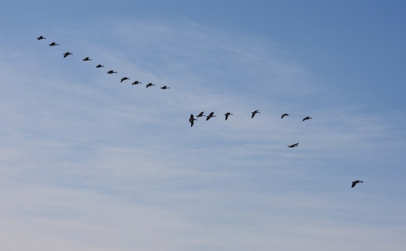 If it would not have been for their characteristic calls I would have missed the gaggle of Canada geese flying overhead at the Heritage Wetlands Park. It was a sunny day with a steel blue sky and the large dark birds stood out distinctly against the backdrop. I was about to dismiss them, after all, Canada Geese are one of the most common year-round occurring birds in these neck of the woods, when my trusty birding partner pointed out that they all stopped beating their wings at exactly the same time. The gaggle started soaring, aiming for a water landing at the far eastern edge of the wetlands. There might have been two dozen individual geese but they all seemed to be of the same mind. Maybe they had a predetermined flight plan? Maybe its was a routine flight that they do on a regular basis? Maybe there there was a lead goose that issued a subtle signal that had all of them stop beating their wings at the same time? Perhaps you have to think like a goose to fully understand what made them work in unison.