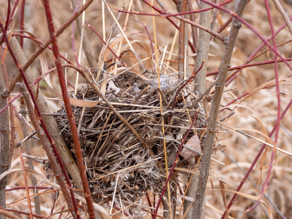 With the leaves gone, the branches are exposed revealing nests that were occupied just a few months ago. Meticulously constructed using twigs, grass and lined with feathers these were the domiciles where baby birds were hatched, reared and before moving out and moving on in life. Of course, when the nests were inhabited they were well-concealed by foliage. Will the same inhabitants return next year? Will new tenants move in? Are these disposable nests used only one season? What shape will the nest be after the winter?
