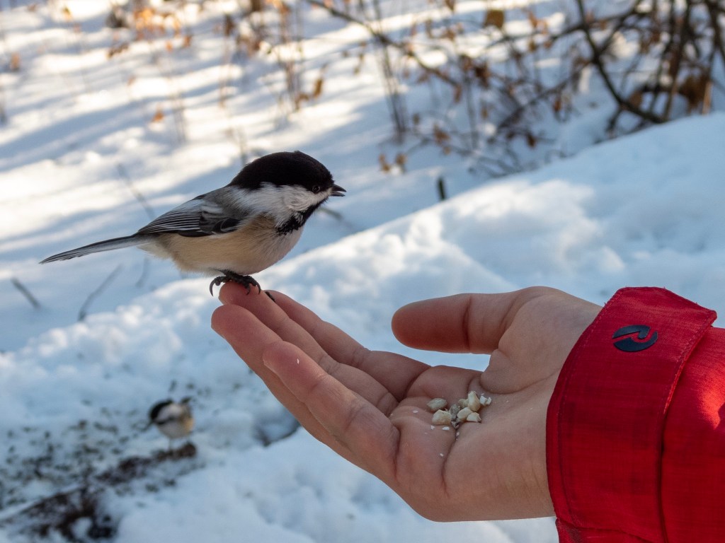 At this time of the year there seems to only be one single thing on the mind of the Black-capped Chickadees…, food. They seem to spend all their time looking for food and feeding and clearly view us humans as a source of food. A 1992 study estimated that chickadees, and similar small birds, need about 10 kcal per day to survive. Chickadees consume a wide range of food stuffs, including insects and seeds. One of their favorite treats, particularly this time of year, are sunflower seeds. According to my calculation a single hulled sunflower seed has on average 0.29 kcal (100 grams of sunflower seeds has 585 kcal, which corresponds to approximately 2000 hulled seeds…, the rest is math). This little fella was thoroughly enjoying his snack and in the pan of a few minutes came by about 10 times to pickup another seed. That means he got about a third of its daily energy intake from the snack we brought. Here is more food for though. An adult chickadee weights about 10 grams and this adult birder weights about 8000 times more. If I would have the same daily per gram energy requirements as the chickadee my total daily energy requirement would be 80000 kcal, about 30 times what it actually is. I would get all my energy from sunflower seeds I would have to consume almost 14 kg of hulled sunflower seeds every day. There is some food for thought. Fortunately metabolic rates in warm-blooded animals does not scale linearly, but that is a different story.