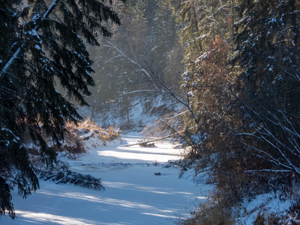 Looks can be deceiving, specially when it comes to ice. After a few days of cold temperatures the creek finally froze over. This was followed by snow covering up the ice. After all of this the creek looked like it was frozen solid and that it may support a person walking on it. In reality the ice is thin enough to be entirely transparent and is fat from being thick enough to support a person. It will take a weeks of extremely low temperatures (in the double digits) to make the ice thick enough to walk on. The moving water under the ice likely causes it to take longer to build up thick ice.