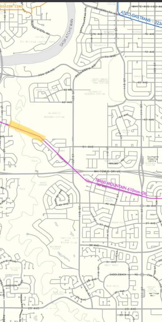Anybody that has been to the Whitemud Ravine between Fox Drive and Snow Valley has seen the odd looking orange bridge crossing the ravine. Although it clearly has a catwalk on top, it is not a bridge for mere mortals as it is fenced off at both ends. Below the catwalk there is a thick pipe. I have never been able to put my finger at what this bridge is for. Some people have suggested that it is a sewer pipe. That does not make sense as it would freeze in the winter…, and we all know what happens when water/beer/sewage freezes in a enclosed space. The only other thing I can think of that would be impervious to freezing winter temperatures would be an oil flowing through the pipe. Up to today I have not had any evidence suggesting that this is an oil pipeline, other than it would make more logical sense than a water/sewer pipe and the fact that we have a lot of oil pipelines crisscrossing Alberta. That was until I came across a map of pipelines running through Edmonton. The map reveals that there indeed is an oil pipeline crossing the Whitemud Ravine at exactly this location. On the map the pipeline is labelled as “TRANSMOUNTAIN-610mm-OIL” and it originates at the Kinder Morgan Terminal at the outskirts of Edmonton. This terminal is a transit and storage facility for crude oil. So while this provides some answers it also raises many new questions. Is this “The Trans Mountain” pipeline that carries crude and refined oil from Alberta to the coast of British Columbia and that there has been so much debate around in regards to its expansion? It seems a bit puny for being The Trans Mountain pipeline? Is the pipeline still active? Perhaps it is an old route and as been decommissioned? What is the history of this section of the pipeline and why is it running right through (above) the the Whitemud Ravine and through residential areas?