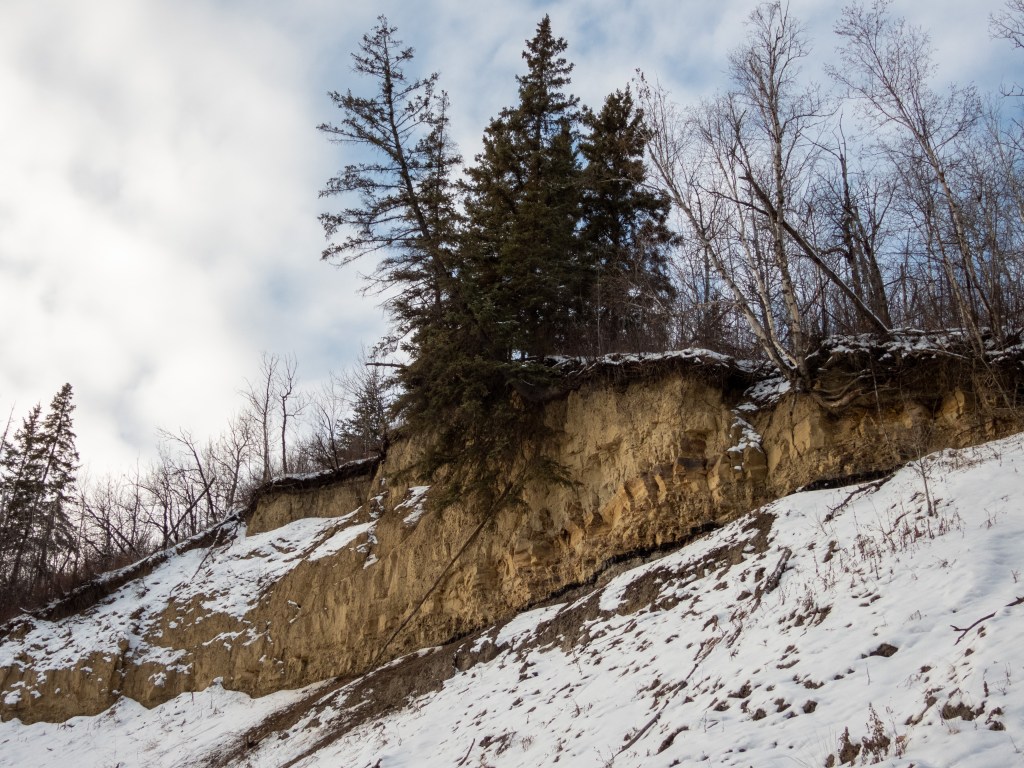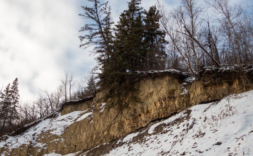 One does not have to go far along the Whitemud Creek to see striking evidence of ongoing erosion. In many of the creek’s meanders one the creek is craving out overhangs that result in vegetation clinging to increasingly unstable overhangs of dirt. It appear that the soil is quite loose throughout the ravine and as a result these overhangs collapse on a regular basis. In many of the meanders there are large amounts of trees that have fallen during one of these collapses. Clearly the meandering course of the creek, the loose soil and the never ending industrious work of the local beavers all contribute to the changing landscape. This stands in stark contrast to the various structures humans put in place to mitigate and control the erosion, such as planting fast growing plants, using carpets to hold the soil in place and building large fields of boulders along the outside curves of the creek.