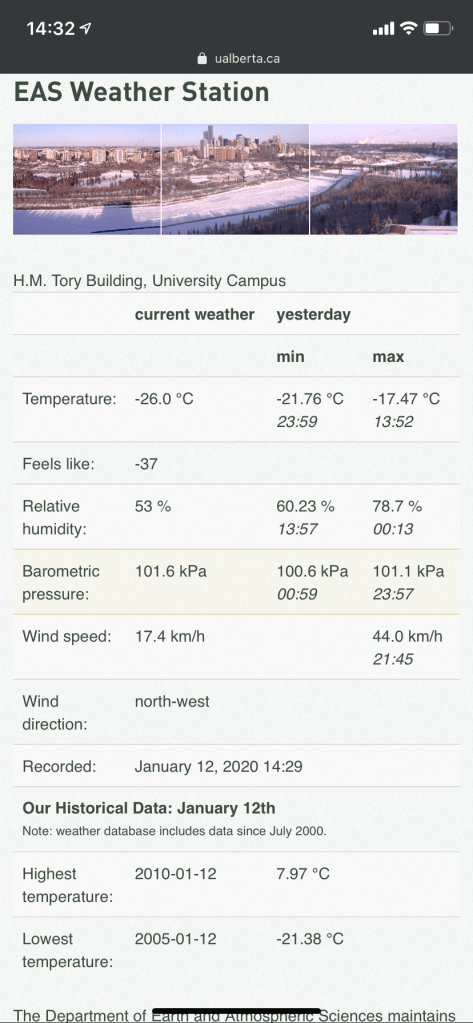 You know it is cold when the local ski hills shuts down due to the bitter cold and the weather forecasts start to refer to the temperature as “bitterly cold”. The thermometer on my backyard deck reads about -25 °C, once you factor in the breeze the windchill drops the temperature down to -37 °C. At these temperatures exposed skin can get frostbites in less than 10 minutes. Yesterday I did try to got for a nature walk at the Grey Nuns White Spruce Park in St. Alberta. I lasted for about 30 minutes before I had to call it a day, and that was about 5 °C warmer than today. While I was hoping for milder temperatures today, once I checked the temperature this morning I knew that heading out for a walk and birding was out of the question. So today’s picture will be of my thermometer this morning.