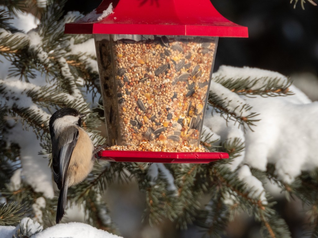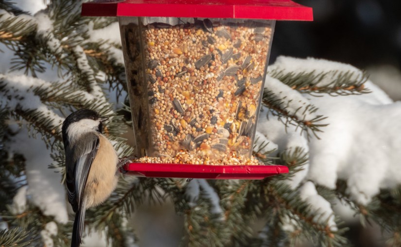 Today’s picture is of a fuzzy Black-capped Chickadee that is visiting one of the bird feeders in Hermitage Park. Any nature walk in these neck of the woods this time of the year (or any time of the year for that matter) will virtually guarantee the companionship of Black-capped Chickadees. There does not seem to be a temperature low enough to faze these diminutive birds. They always seem to be on the go and always looking for the next meal. This one has struck the mother lode.