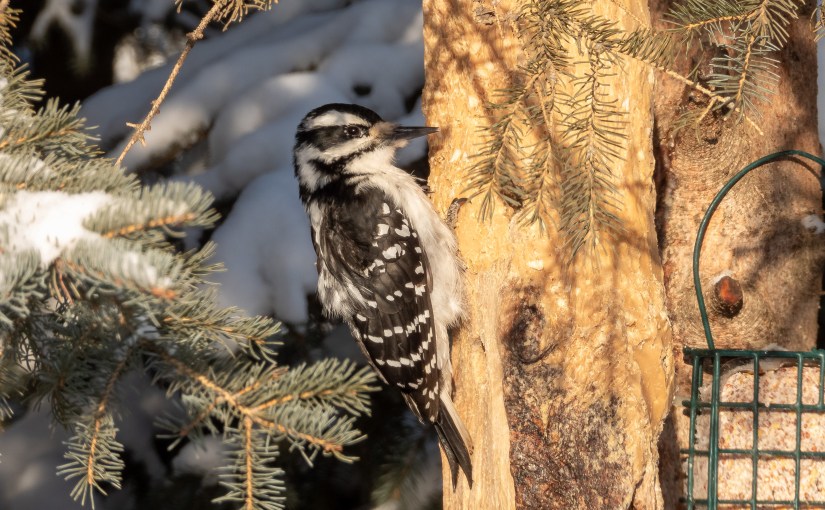 The last two post have featured a Downy Woodpeckers, first a female and then a male. There is, however, another woodpecker in town that looks nearly identical to the Downy Woodpecker. The Hairy Woodpecker is a tad larger than the Downy, with a distinctly longer bill. There are also some even more subtle differences in the black and white markings the the outer tail feathers of the two species. To make things even trickier, the two species can be found in the same habitat and often if one of them is around, the other one is not far away. Today’s picture is of a female Hairy Woodpecker. The telltale sign is the proportionately longer bill relative the head. My rule of thumb is that in Hairy Woodpeckers the length of the bill is more than half of the width of the head while in Downy Woodpeckers the bill is decidedly less than half the width of the head. As with most things in life, the more of the two species you see and compare the better one becomes at telling them apart.