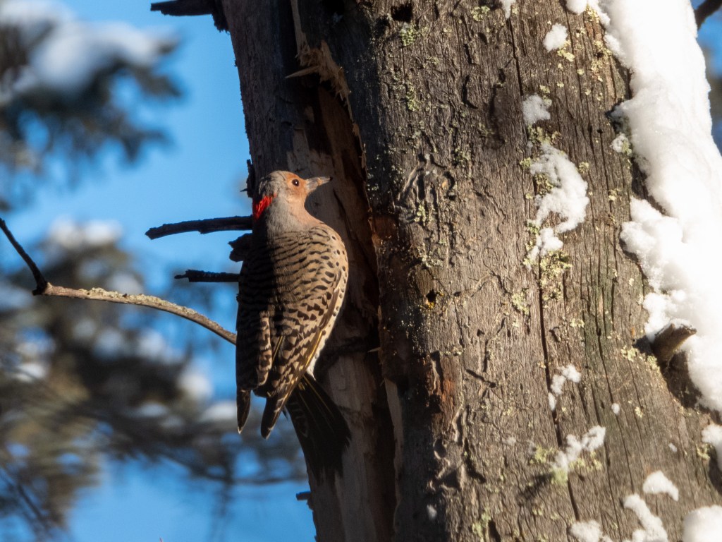 Next to a pair of hardworking Pileated Woodpeckers there was a solitary Northern Flicker working away on the same dead tree. Was it a coincidence that the two woodpecker species were at the same tree? Perhaps this a tree was particularly good for woodpeckers? Or perhaps the flicker was opportunistic and followed the Pileated Woodpeckers along through the forest taking advantage of the large gashes in the trunks the Pileated Woodpeckers leave behind? The Norther Flicker was illuminated by the late afternoon sun which made it particularly splendid against the blue sky. As the Pileated Woodpeckers moved on, so did the Northern Flicker.