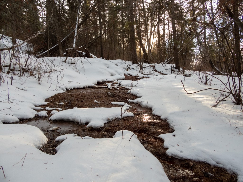 I started following the creek upstream. Occasionally it disappeared under the snow and I had to either make an educated guess based on the slope of the terrain from which direction it might be coming from or, if I stayed completely still, I could hear the trickle of water leading me upstream to where it made appeared again. Progressively the rivulet became wider, at times reaching a meter across.