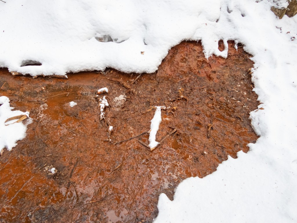I had been following the rivulet for quite some distance into the forest and up the slope of the ravine when, all of a sudden, it changed color. Quite abruptly it went from black to rusty brown color.