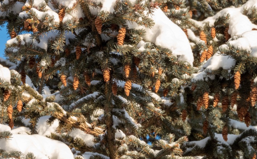 If you look at a spruce tree closely you may notice that all of the cones seem to be at the very top of the tree. The reason for this is an interesting life-history adaptation. A single spruce tree carries both female and male cones. Spruce trees, and conifers in general, depend on the wind to reproduce. In the spring, short-lived male cones produce pollen, which is carried to female cones by the wind. Usually, male cones grow toward the bottom of the tree and female cones toward the top, which reduces the chance that polled from the male cones “falls down” on female cones. Self-pollination is a bad thing since it could lead to reduced genetic variability and inbreeding. So if the male cones are at the bottom of the tree, how come the only visible cones are at the top of the tree. As it turns out, while the female cones are large and conspicuous while the male cones are small and inconspicuous.
