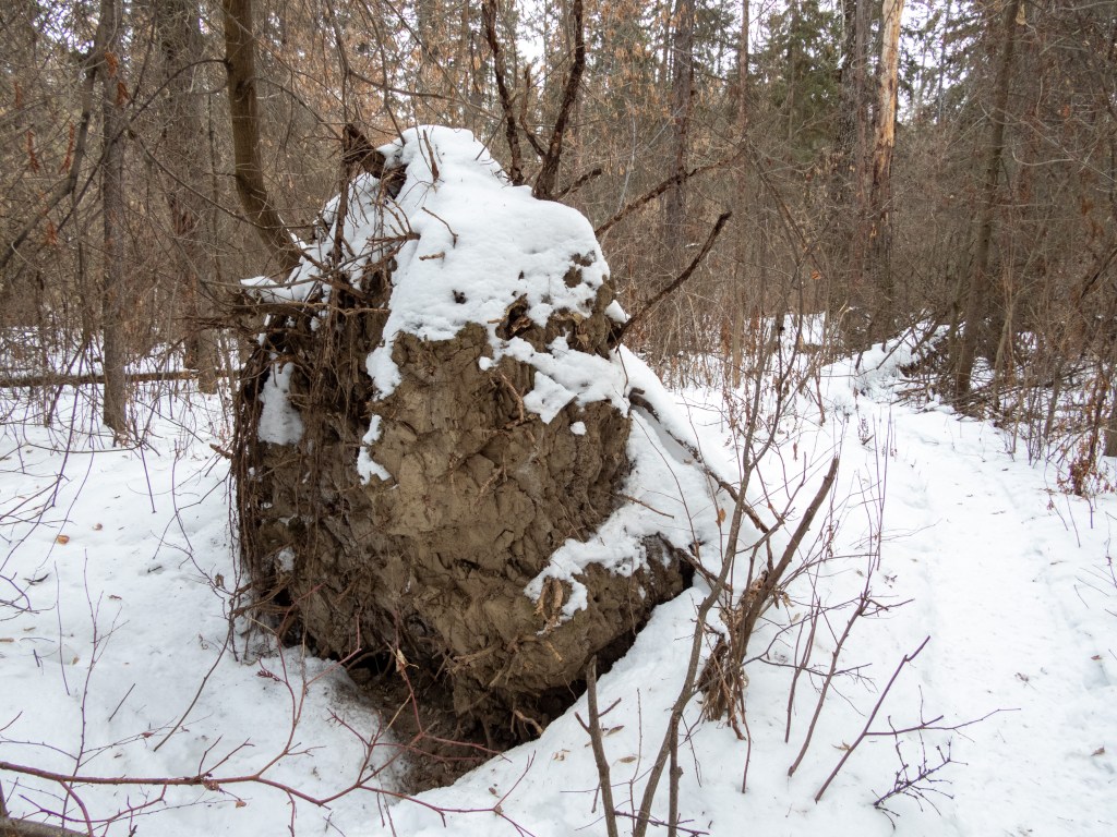 Windthrow refers to trees that have been uprooted by wind. In the Whitemud Ravine there is a large number of windthrown trees with large exposed root plates. When I grew up I was told that windthrown trees with exposed root plates could be dangerous as the tree could spring back up. For a long time I thought that this only was a myth but when I decided to do a bit of research for this post it turns out that it actually does occasionally happen. When severe weather conditions cause trees to fail from their root plates the tree root’s may still be connected on one side. As a result this can cause the tree to be under a spring-like compression tension. All it may take is a minor disturbance, like a wind gust or a person standing on the tree to release the tension and spring the tree back to an upright position.