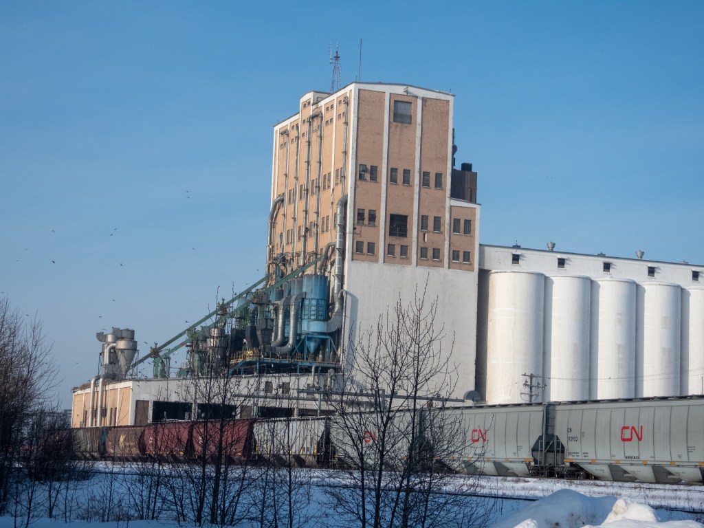 Like a sentinel of a long lost time the urban grain terminal in north Edmonton is still very much in business. The terminal has been in operation since 1924 and last year 400000 tonnes of grain passed through the terminal. Seed crops arrive at the terminal from Alberta farms and are sorted, cleaned and graded before being loaded onto a train bound for Vancouver and the ocean journey to overseas customers in countries like Japan. This bounty of grain has not gone unnoticed to the local pigeons that flock to the south side of the structure in the thousands. I assume that there must be spillage as the grain is loaded and unloaded from train cars. While the location is a birding hotspot, not so much because of the pigeons bur rather due to the birds of prey that are attracted by the pigeons it makes you wonder if rodents also are attracted to the location by the abundant food source. Officially Alberta is rat free (there is an oxymoron for you), but this location seems perfect for an Alberta-grown rat colony (if there is such a thing).