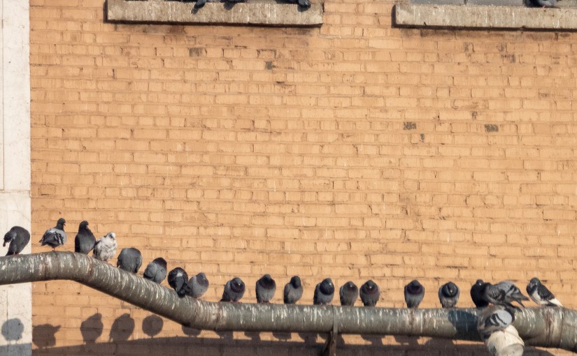 Like silent feathery gargoyles the pigeons were snoozing on the duct work of the grain terminal. As I was scanning the thousands of pigeons covering the facade of the hundred year old brick building I was thinking to myself “why are there so many ducts?”. Is it ventilation or heating? Who knows what it takes to store and transport gain. The pigeons did not seem to ponder such trivial and technical details. The merely seemed to enjoy the duct work as a place of resting and pooping.