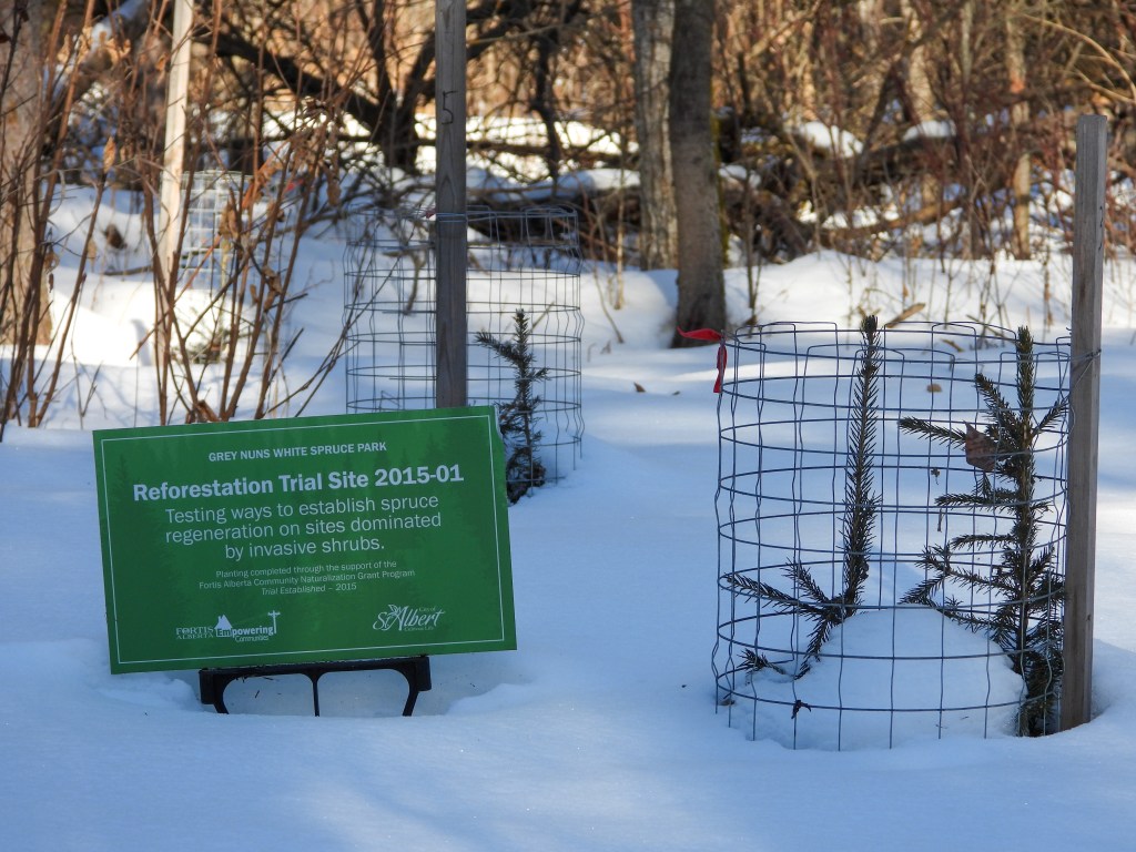 As one wanders through through the Grey Nuns Spruce Woodlot you come across a large number of spruce seedlings with protective mesh around them. Apparently around 2500 seedlings were planted in 2019 and a total of over 11,600 spruce trees have been planted since 2016 in an attempt to return the area to its native spruce forest, particularly on locations that were dominated by invasive species. The Grey Nuns White Spruce Forest is an ecologically and historically significant area located at the outskirts of St. Albert and has been designated a Municipal Historic Resource. It is the home of many trees that are well over 100 years old, and a habitat for a variety of birds, mammals, plants, and amphibians.