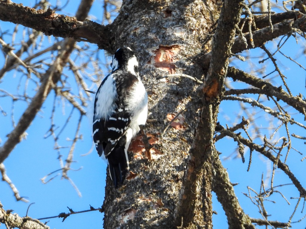 This Hairy Woodpecker did not fancy getting its picture take. Instead of just flying away it turned its back on me. Perhaps the tree was a good source of food and it wanted to spend more time foraging there? The subtleties that differentiate hairy an Downy Woodpeckers are intriguing. I have seen enough Hairy and Downy Woodpeckers to tell that the slightly larger size of this one means it is a Hairy Woodpecker. If you can see the bill, that would be another useful clue. In hairy Woodpeckers the bill is almost as long as the length of the head (if you would “fold the bill over backwards” it would almost reach the other side of the head), while in Downy Woodpeckers the bill is substantially shorter relative the the width of the head.