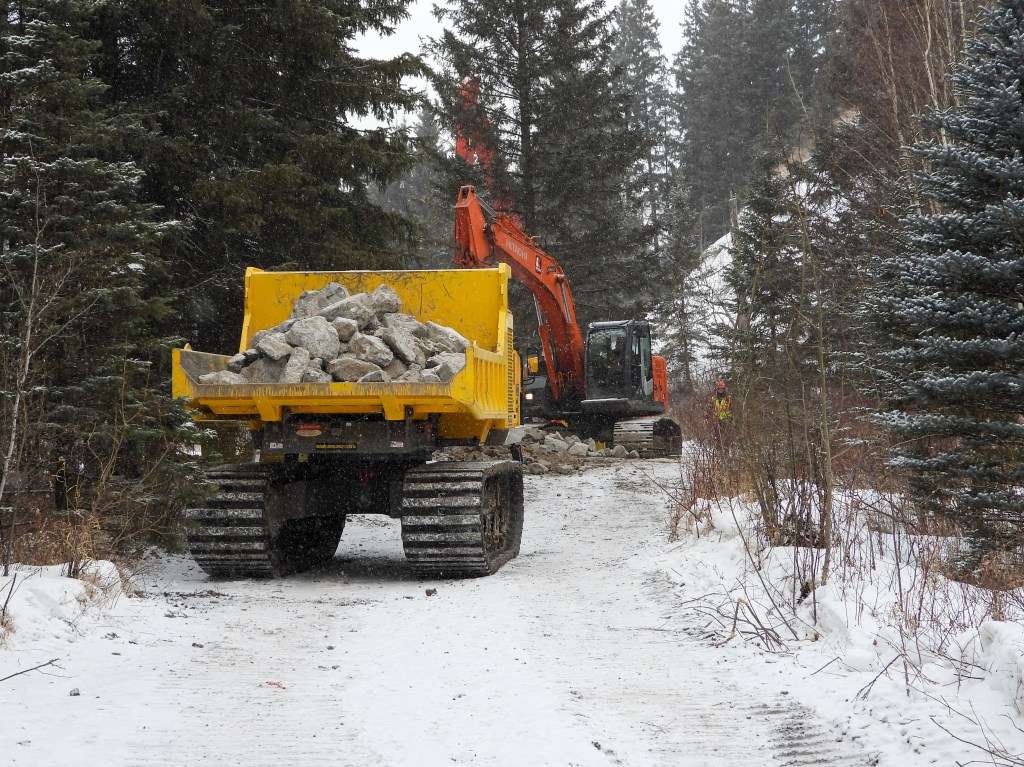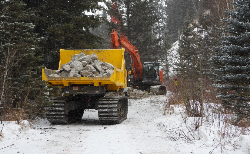 The Whitemud creek can be a busy construction zone. During spring, summer and fall the beavers are busy with their engineering handiwork. In the winter, however, another form of construction, or rather reconstruction, is taking place. This is when humans come in and try to undo what the beavers have built. Over the last few weeks the city crews have been busy shoring up one of the meanders in the creek that was threatening to undermine and collapse the main path.