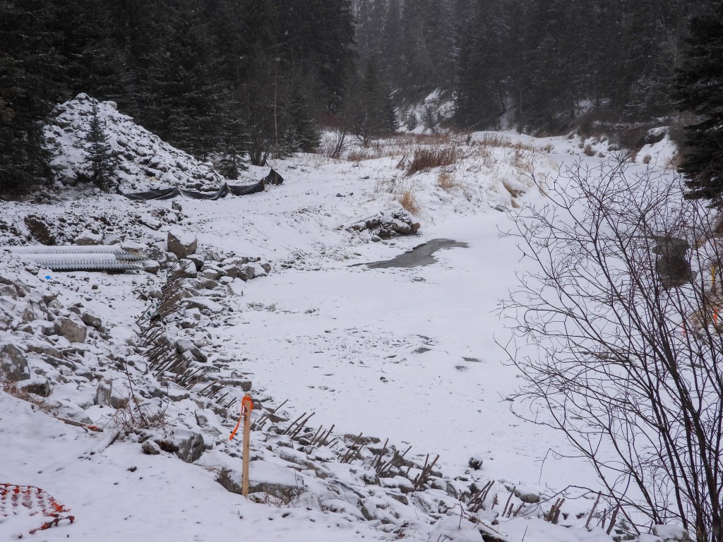 So in yesterday’s post the picture showed the big all terrain machines the crews are using do reconstruct the Whitemud creek after the beavers’ handiwork. Today’s picture shows what the reconstruction entails. While much of the terrain is blanketed in a fresh coat of snow one can still make out the field of boulders that now line the left bank of the creek. This is the outside of the meander where the erosion is the highest. It appears that shrubs have been planted along the base of the boulder field, likely to stabilize the slope further. In the pat I have seen lots of beaver activity along this stretch of the creek. It is going to be interesting to see how the beavers will take this change to the scenery.