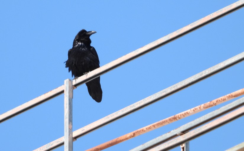 In the Whitemud Ravine one often comes across ravens around the orange pipeline that crosses the creek close to the Snow Valley end. Last spring the several raven couples even tried to build stick nests on the pipeline. None of them seemed to be successful, however. The other day I caught a raven sitting on the catwalk railing above the pipeline. Is it staking a territory? Is its choice of vantage point just a matter of a good view? Who knows why the ravens enjoy the pipeline.