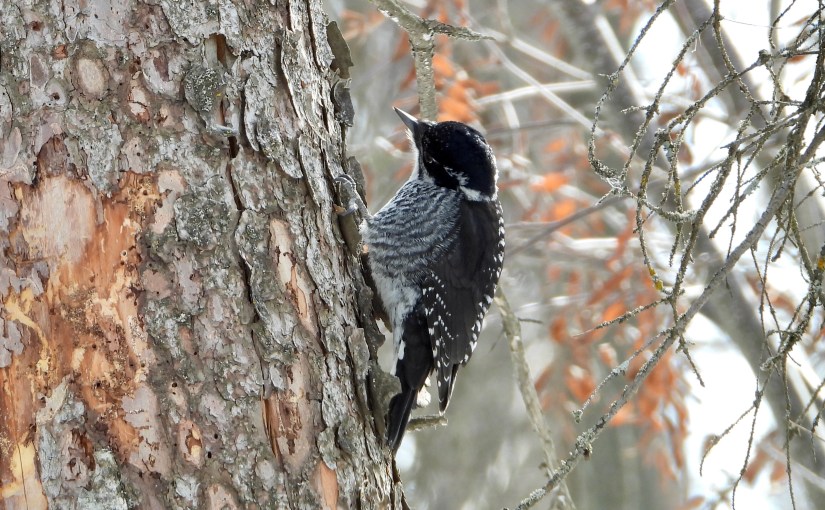 In a clearing at the Grey Nuns Spruce Woodlot a lone American Three-toed Woodpecker was busy working away looking for a meal on a spruce tree trunk. It is only the second American Tree-toed Woodpecker I have seen, the first one was last winter at the Whitemud Ravine. No wonder this one threw me for a bit of a loop. With too much black in its back to be a Downy Woodpecker and too little black on its back to be a Black-backed Woodpecker it had me scratching my head for a minute. This one had a black back with messy white barring and white spots in the wings. The underparts were white with fine blackish barring on the flanks. The face was black with a white line behind the eye and a thin white line below the cheek. The characteristic yellow head patch that males have was missing suggesting that this was a female.
