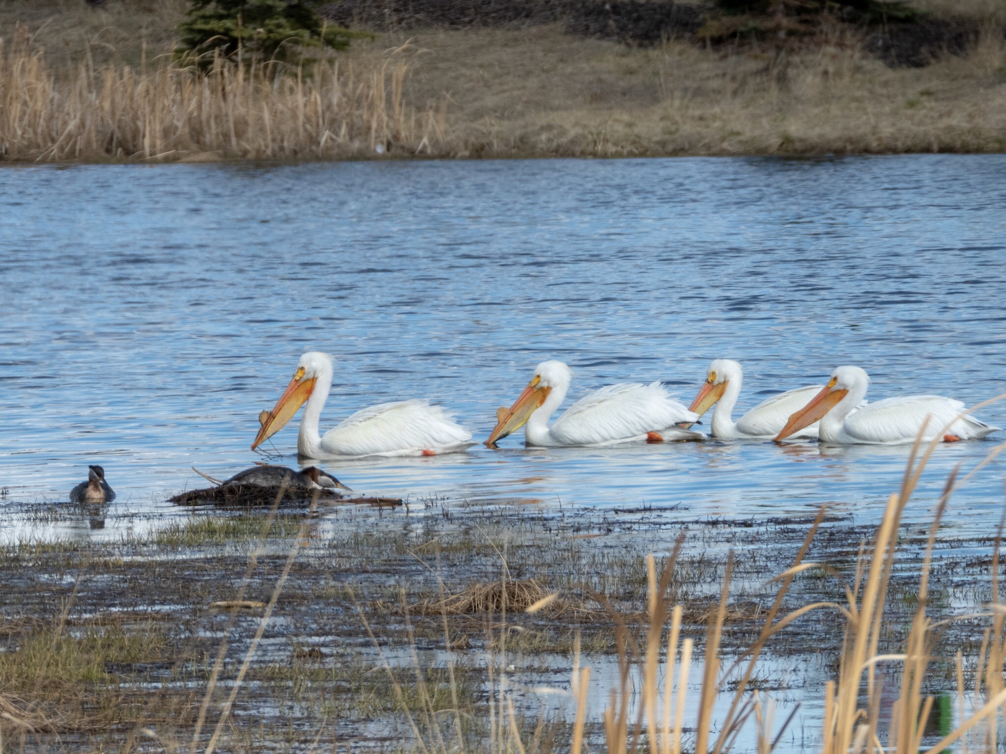 It was only as I was writing this post that I noticed that there are a pair of Red-necked Grebes next to the pelicans. One of the grebes looks like it is sitting on a mound. I am curious if this could be a nest. Yet another reason to head back sooner rather.