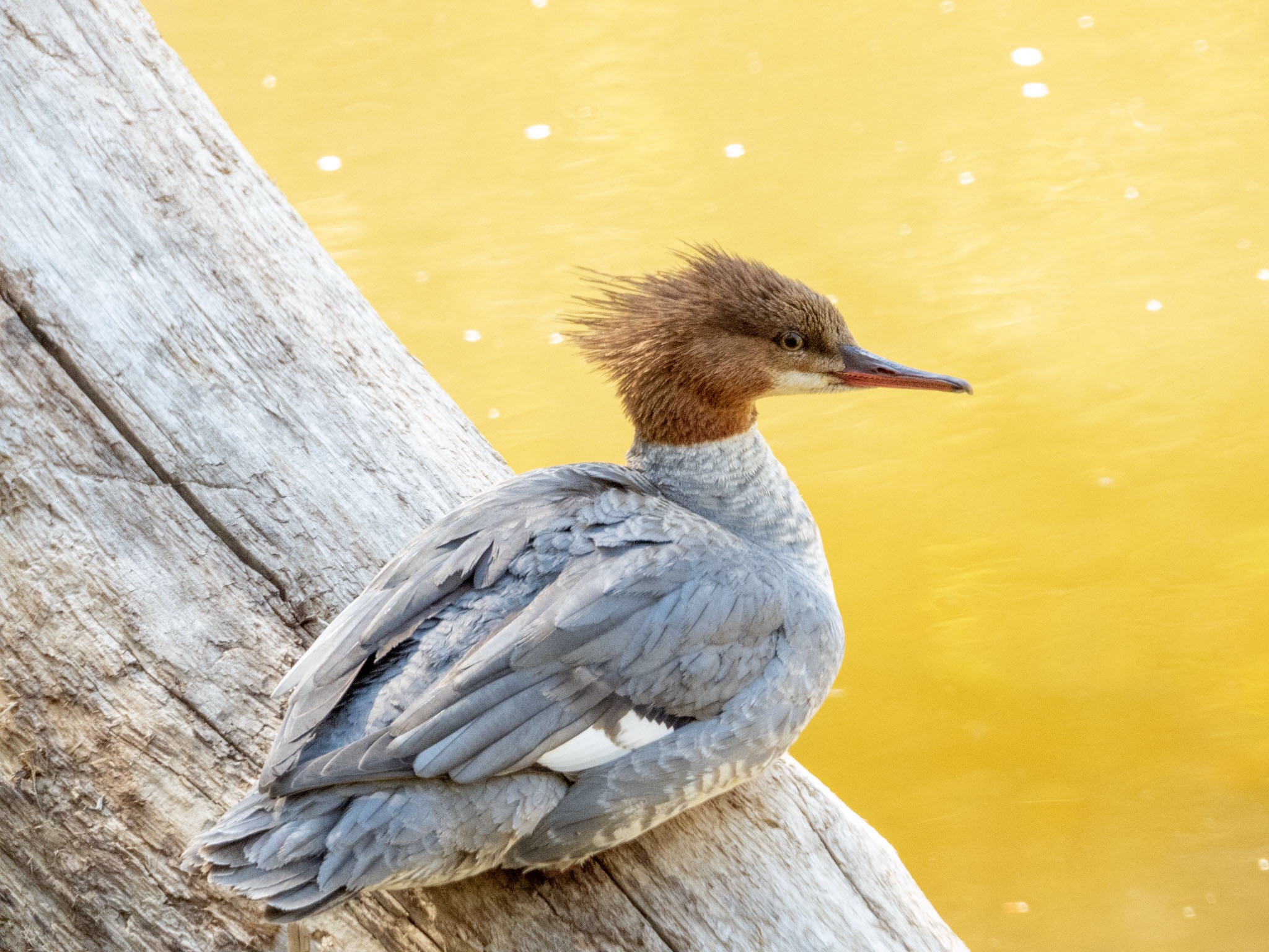 Found this lovely Common Merganser (Mergus merganser) down at the Whitemud Creek yesterday morning. There its was, just chilling on a log with its funky hairdo…, er, “featherdo”? If you look closely at the picture you can see the serrated edge of the bill. Mergansers eat fish so this helps them grip their prey. Sometimes they are referred to as sawbills. The famed naturalist and painter John James Audubon referred to these as Buff-breasted Merganser and Goosander in his 1827 book The Birds of North America. This particular merganser appeared to be alone and is likely either a non-breeding male or a female. Once males reach their breeding age (2 years) their appearance changes a black head and white body. Nonbreeding males and females are tricker to tell apart. None of the information online provided any clues as how to tell them apart. If in doubt, consult your Sibley! According to Sibley, adult nonbreeding males have a white stripe on their wing, which can clearly be seen in this picture. So there you have it folks, it’s a lonesome bachelor. Just a bit downstream there were several merganser couples swimming around romantically in the murky water. I guess this fella either did not get lucky this year or is not ready to commit, not that male merganser commit much as they do not help the female to care for the eggs or young.