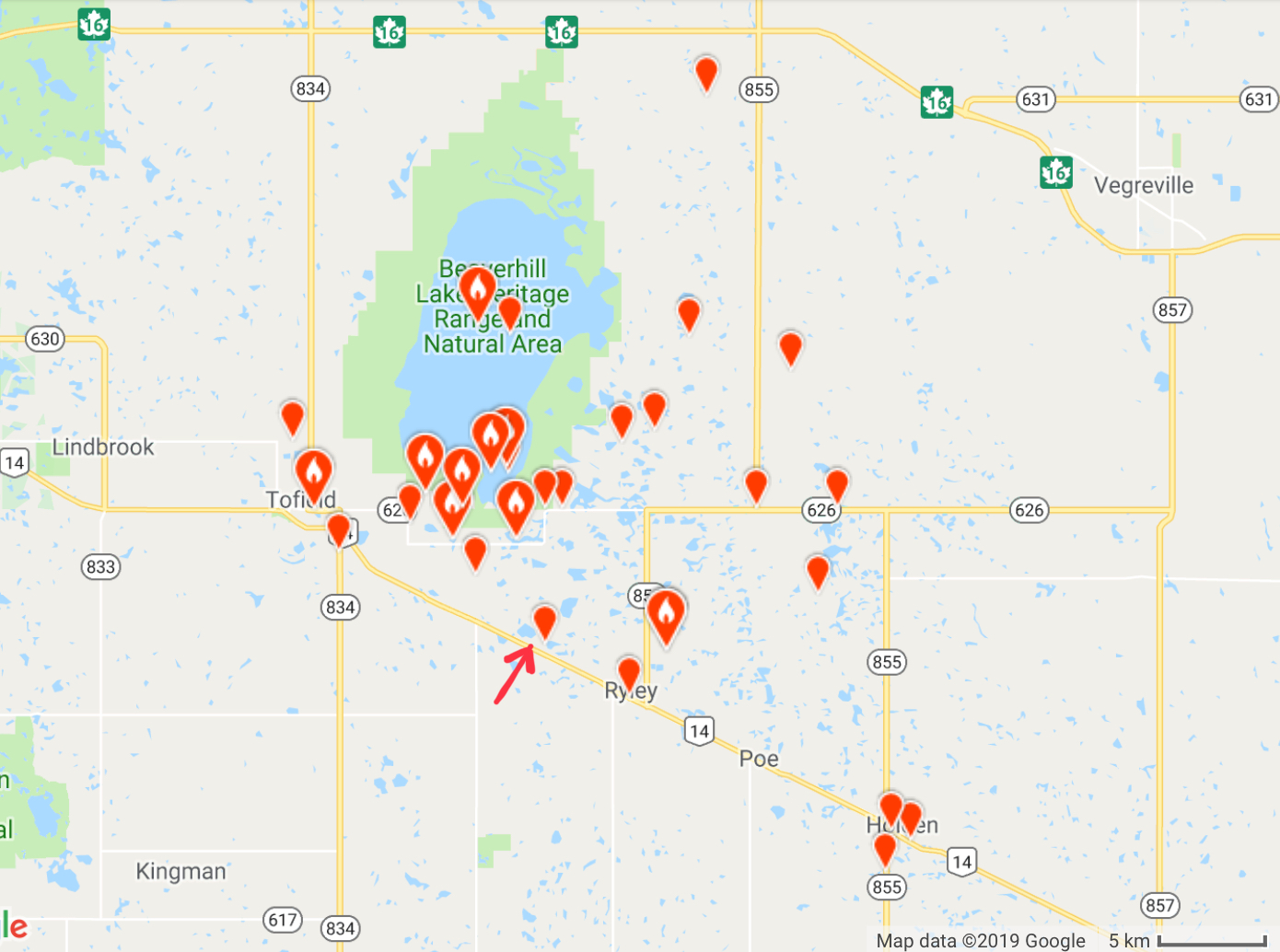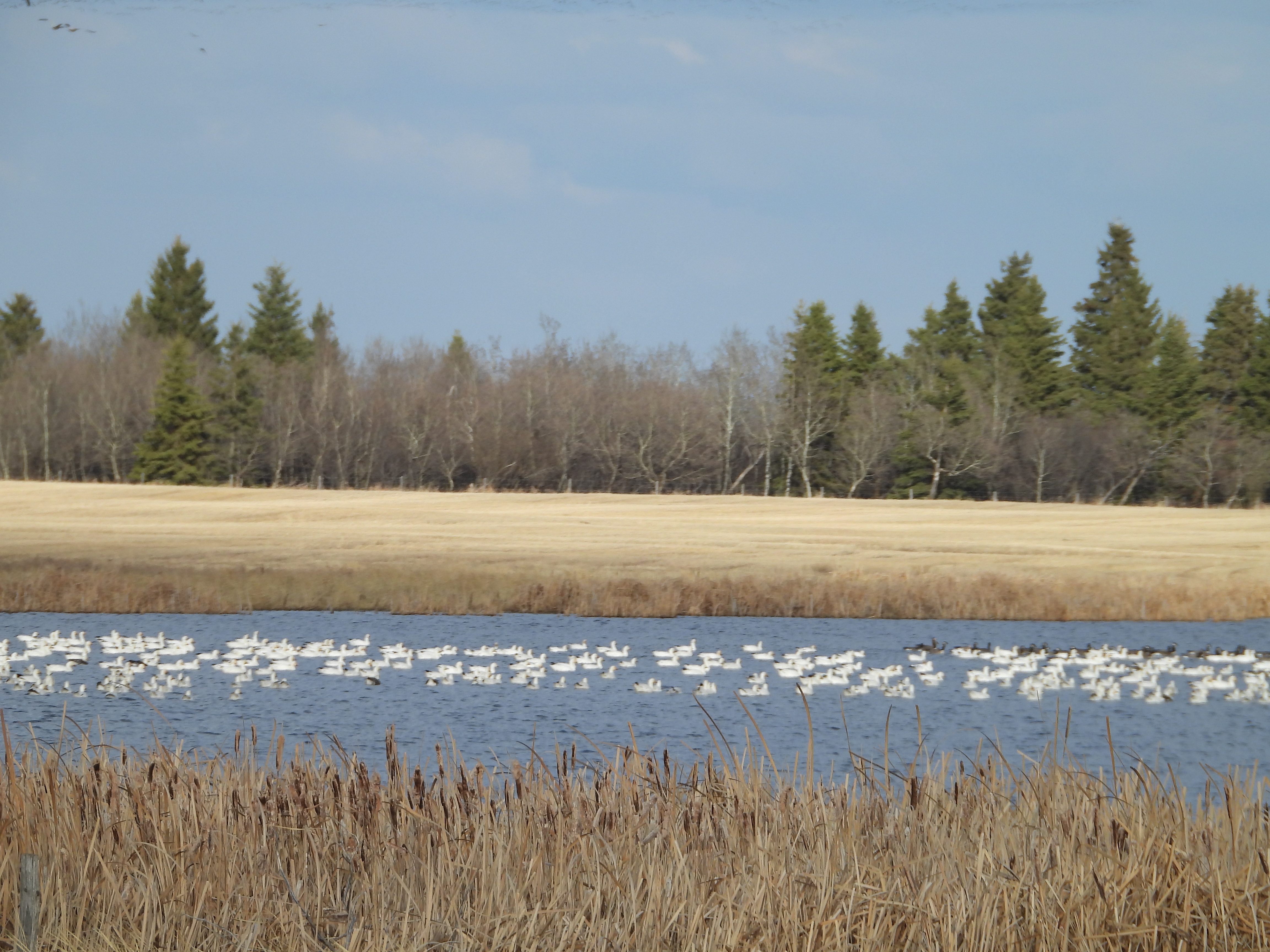The map below shows the reported Snow Geese sightings around Beaverhill Lake in April this year, so basically roughly over the last three weeks. The location indicated by the arrow is where we found them. In our quest to find the Snow Geese we covered several hundred kilometres of dusty back roads in this area during three separate field trips. We visited most of the location where they have been reported this month. It appears, however, that the geese are quite mobile. While we saw lots of other birds (e.g. Canada Goose, Cackling Goose, Mallard, Northern Pintail, Northern Harrier, Rough-legged Hawk, Black-billed Magpie, European Starling, Ring-billed Gull, American Crow, Black-capped Chickadee), we never managed to catch the Snow Geese in any of the previously reported locations. In the end, once we had basically given up and started to head home, we stumbled across them at a location where they had not previously been reported at perhaps the most unlikely of places, a small lake at this side of a busy highway.