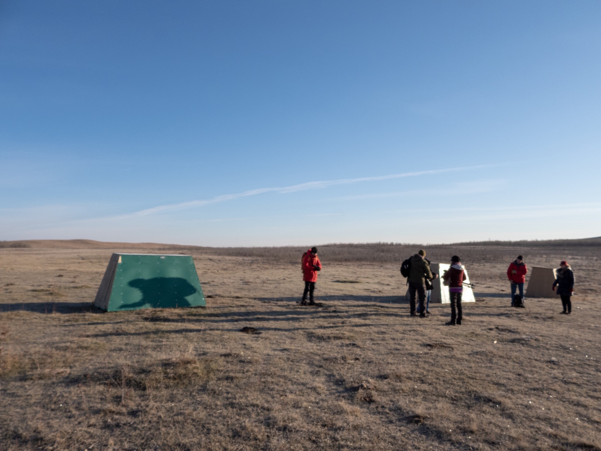 We counted a total of 35 Sharp-tailed Grouse on the field in front of the blinds, some right outside the blind and up a radius of about 30 meters from where we were sitting. The display grounds, called a lek, were covered by short native grass that looked like it had been grazed. The large turds on the dance floor suggested that cattle could be grazing here. The lek was surrounded by taller grass and shrub that could provide cover for the grouse if a predator would show up and crash the party.