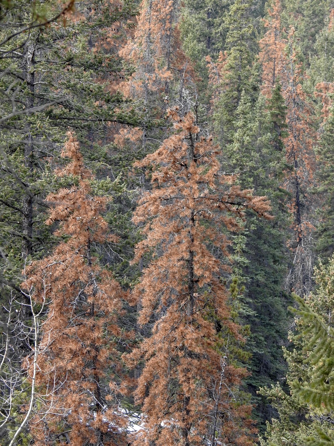 There are many cultural depictions of black birds, such as ravens and crows, that associate these birds with ill omen and death. Clearly these are figments of peoples’ imaginations. Black birds are highly intelligent, uber cool, and ecologically important as they are ubiquitous, globally distributed and take on the roles of predator, prey and scavenger, all in one. This picture from Jasper National Park is emblematic of some of those darker cultural depictions that these birds sometimes are associated with. At first glance there may not be any apparent death or ill omen here, but upon closer inspection, the rust coloured needles of the surrounding pine forest, tell a different story. These “red tops” have succumbed to the mountain pine beetle. Over the last several decades this beetle has ravaged the pine forests of British Columbia, and more recently it has spread into Alberta. The underlaying reasons for this multi-decade epidemic are complex and multifarious with books written about it. Without getting into details, the ultimate causes of this cataclysmic epidemic can all be attributed human arrogance, misguided policies, science illiteracy and greed.