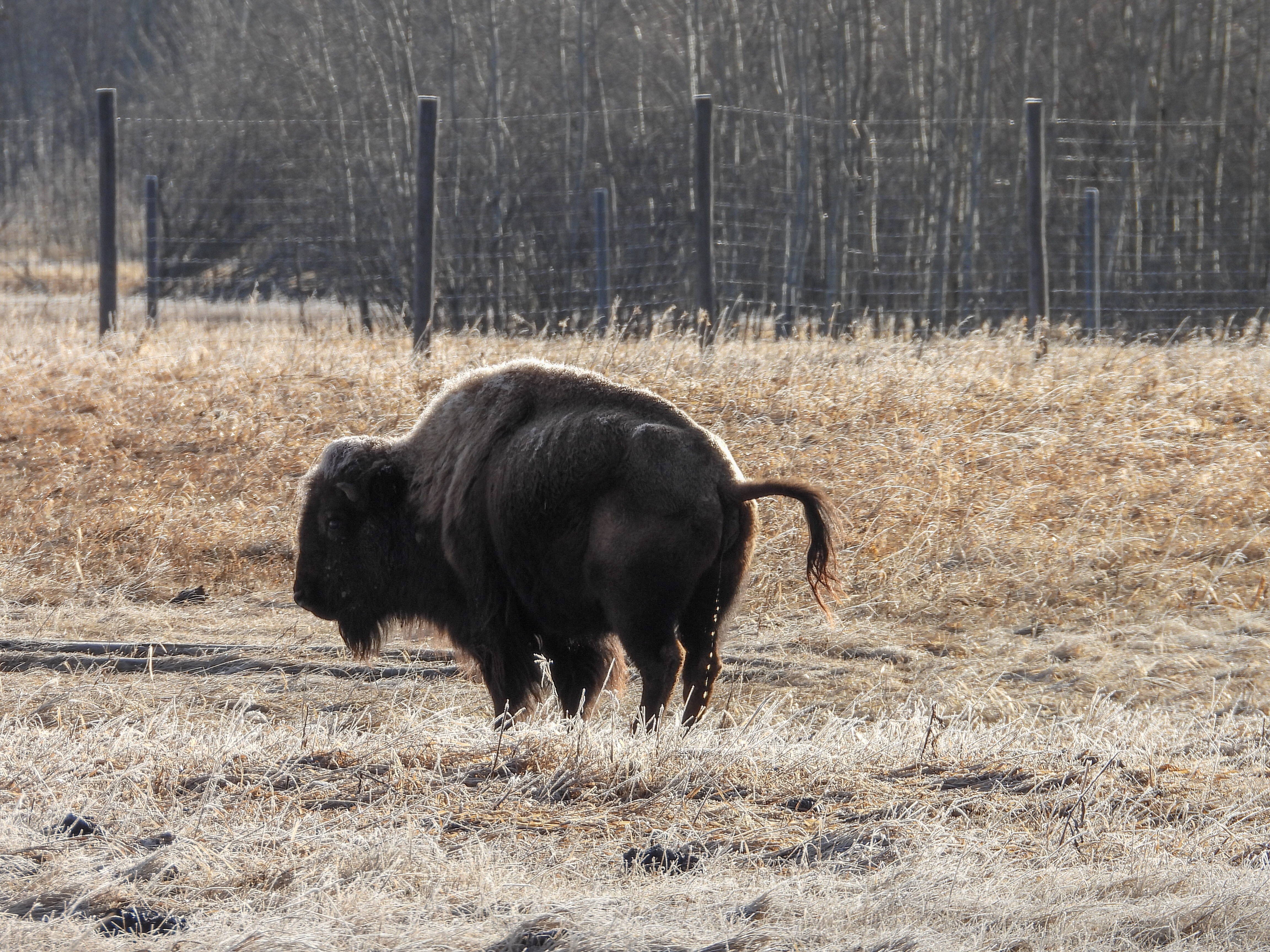 At the edge of a grove, away from the melee, a lonely bison mom and her calf were having a moment. The reddish brown calf was quite assertive, pushing its head into the mom’s groin, clearly letting her know what it wanted. I was probably not more than 25 meters from them, stuck in a bison traffic jam in the Bison Loop at Elk Island National Park. Mom and calf seemed not to mind my presence at all. I opened the sunroof of the truck and climbed out with my camera. This vantage point gave me an unobstructed view of the surroundings. As I was observing mom and calf I was surprised when I realize that the cow had horns, something I had assumed only male bison would have. It turns out that the physical differences that distinguish males (bulls) from females (cows) are quite subtle so determining a bison’s sex is not entirely trivial. Clearly the presence of horns cannot be used to tell males and females apart. Although a cow’s horns are slightly more curved and slender than a bull’s, one would likely have to be quite experienced to be able to pick up on this. Obviously a bison feeding a calf is one sure-way of positively identifying a female.