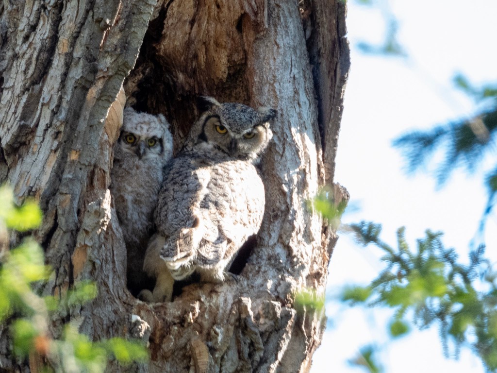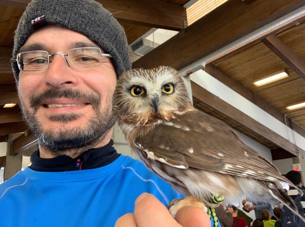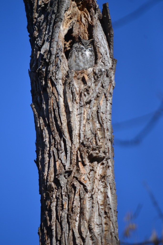 Great Horned Owl basking in the sunlight on a cold winter’s morning.Great Horned owlets checking out their neighborhood.Great Horn owl mother in her lair.Ricky the Saw-whet Owl hard at work educating future generation of birders.Splendid Snowy Owl just doing what it does best, looking majestic.